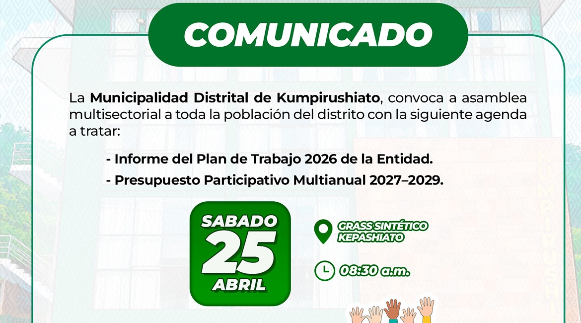 La Municipalidad Distrital de Kumpirushiato, convoca a asamblea multisectorial a toda la poblaciΓ³n del distrito con la siguiente agenda a tratar: